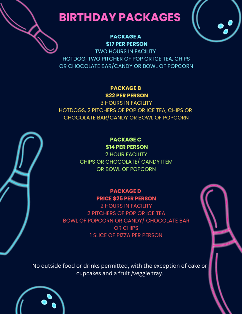 Make your next birthday or private party unforgettable at our welcoming, family-owned bowling alley. Choose from customizable packages and enjoy the support of our friendly staff, plus exciting amenities that guarantee anenjoyable celebration for everyone.